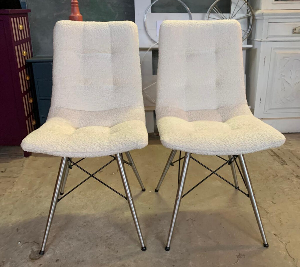 De stof van deze stoelen was helemaal versleten, echter de stoelen zelf verkeerden nog in perfecte staat. De klant koos een mooie lichte bouclé stof waar ze op de valreep ook nog een lamp mee bekleedt wilde hebben. De stoelen zien er weer helemaal fris uit, goed voor weer jaren zitplezier! Ook de lamp heeft een veel warmere uitstraling gekregen. Wat een nieuw stofje toch niet kan doen 🙂 Een leuk project zo met al die touwtjes door de gaatjes krijgen! We zijn weer een tevreden klant rijker.